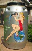 A charity event in La Grange, IL. Barrels are sponsored by local businesses, painted by a local artist (in this case me, at Art & Glass!), and auctioned in Sept 2010 for charity. A Rain barrel is a water tank used to collect rain water from your roof for later use, generally garden watering.