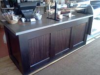 A minor remodeling commission. The fresh paint colours compliment a paneled front counter featuring a concrete top. Countless other details include new handmade signage all around using reclaimed fence wood. The wood, concrete and various metals are repeated harmoniously throughout.