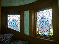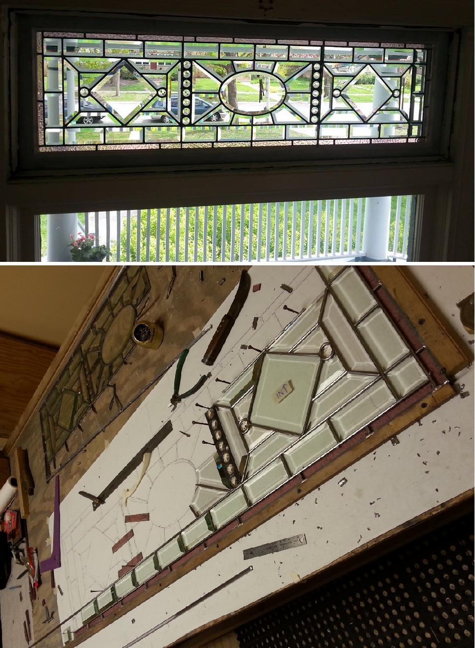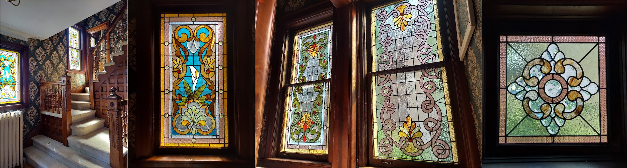 Fitzpatrick residence, Wheaton, IL "After" restoration photos of 4 windows. 2 of which had extensive damage and obscure antique glass